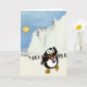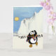 Cute cartoon penguin dancing with a colourful scarf on. His fellow penguins are waddling over rough terrain towards their nesting site in the Antarctic snow. Penguin in front has just retired.