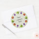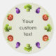Round customisable funny vegetables sticker with cute and funny cartoon vegetables arranged in a circle and custom text. Red tomato, green broccoli and violet eggplant have an amazed look in their funny big cartoon eyes. This funny sticker would be perfect for cooks and people who love cooking and vegetables.
