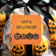 Stickers show four carved pumpkins in a row and "Happy Halloween" in distressed font above. The background is orange and the other elements are black. Funny, cool, and spooky jack o lanterns. One product in a Halloween party suite. Use on envelopes, paper, mail, gifts, loot bags.