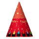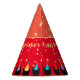 Cats in party hats celebrate in a festive border on this colourful personalised cone hat. Brilliant red and tangerine orange complement a backdrop of pink rose gold stars and layered hearts in faux gold and red. All the birthday honoree's name and top everyone with some fun.