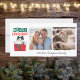 Holiday design features a funny cat inside a present, getting into mischief. It's a meowy Christmas! To the right of the cat personalize card with 2 photos and change default text with your own family name. On the back minimalist watercolor pine trees fill the card.