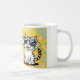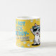 Funny Cat coffee cup Cartoon cat Bright yellow background with doodled fishbones and paw prints
