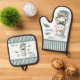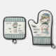 Cute oven mitt and pot holder set featuring an illustration of a funny kitty preparing fish. Great for a anyone loving seafood, cats or the beach.