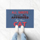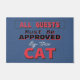 Family and friends will get a chuckle when they read this funny and humourous door mat. Modern Welcome guests with a clear message: All Guests Must Be Approved By The Cat. Modern black, red, white and blue typography style fun quote. Brown textured looking background.
