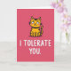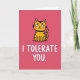 This very funny greeting card features a golden-yellow cartoon cat centered near the top, outlined in black with a few darker stripes. The cat has half-closed eyes, a tiny smirk, and light pink blush on its cheeks, giving it a dry, affectionate look. Behind the cat is a solid fuchsia background that makes the yellow fur stand out right away. Near the bottom, the card says “I TOLERATE YOU” in white block letters, set in a simple sans-serif style. The text sits straight across the lower part of the card and feels like the punchline to the cat’s expression. It’s a funny, slightly sarcastic way to say you care, perfect for a partner, friend, or anyone who gets your sense of humor ❤️💌. Pair it with a little treat and you’ve got a sweet-and-sassy moment 🍫.