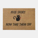 This doormat features a light brown, textured surface with a playful design. At the centre, there's a black cat with white markings, waving a paw in a friendly manner. It's a humourous and inviting way to remind guests to remove their shoes before entering. Perfect for adding a touch of whimsy to your entryway!