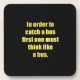 Yellow text on a black background provides a humourous take on problem-solving by suggesting one must "think like a bus" to catch it. The bold lettering enhances the playful tone of the message.