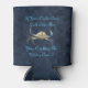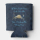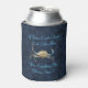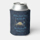 Featured on this stubby can cooler holder on a blue background is a blue swimmer crab with a funny catching crabs logo.