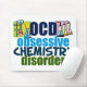Funny chemistry teacher gift that reads OCD Obsessive Chemistry Disorder next to science beakers full of chemicals for an experiment. A cool chemistry major present for a scientist.