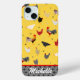 This funny chicken phone case has a Memphis style look with a chicken farm theme. Modern geometric patterns are used in the design to colour roosters and chickens in a pastor with a yellow chicken wire background. There are two big roosters and ten lovely hens in this pattern. A fun updated chicken pattern for a modern country look. Perfect for anyone that is chicken crazy. You can make the pattern larger or smaller on this phone case. Personalise the case with your name. This makes a great gift for anyone that loves chickens and modern design.