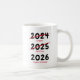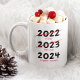 Funny novelty christmas mug featuring a simple white background that can be changed to any color, the humorous saying "2021 crappy, 2022 still crap, 2023 fingers crossed".