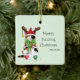 Cute calico cat dressed up in Christmas holiday lights, stuffed antlers, Christmas Santa hat, and a big green bow against a backdrop of light green, The kitty is not happy!