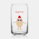 This awesome can glass features a funny cartoon of an egg with arms and legs. The egg has arms and legs and a small crack in its head exposing the white inside. It has blue eyes with a black pupil and a big smile where the yolk of the egg can be seen. The eggshell looks rough. This Christmas egg is wearing a santa hat ready to party this holiday season. There is custom text so you can personalise this design with a name or message. This is the perfect glass for enjoying some eggnog from.