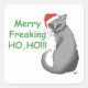 A grey cat wearing a red Santas hat. The grey cat is grumpy about Chritsmas