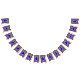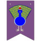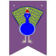 This awesome festive bunting features a bright and bold Christmas Peacock wearing a Santa hat. The bird has a bright blue belly with a beautiful collection of feathers held proudly behind. The eyespots are blue, brown and green. The Peacock has big black eyes and a cute little grey beak.