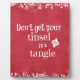 Don't get your tinsel in a tangle Christmas Quote gifts and decor. Fun Christmas decor canvases with funny and cute Christmas quote: Don't get your tinsel in a tangle with red background and bokeh sparkles light edges with Christmas ornament accent.