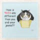 A tabby cat has squished themselves in a yellow box and now the cat is looking a bit like a muffin top