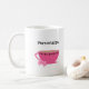 Personalise by adding your name to this funny coffee mug with a cute pink coffee cup with a brown heart border and girly pink ribbon tied into a bowl. It has a humourous coffee joke that says: I told my coffee maker to make me coffee this morning and it just sat there. Do I have to do everything?!