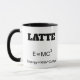 A funny coffee mug with a science pun. The mug says E=MC2 which is supposed to mean Energy = milk multiplied with coffee.