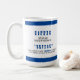 Fun mug for the coffee lover. Coffee spelled backwards is eeffoc and I don't give eefoc until I've had mine. Navy blue and white text.