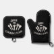 Level up his kitchen game with this funny cooking oven mitt & pot holder set! Featuring the bold text 'Dude Cooking Food' and fun utensil graphics, this black oven mitt & pot holder is a perfect blend of humour and practicality.