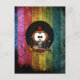 Funny cool rock&roll owl with piercings playing guitar sitting on a colourful wood hole house