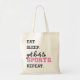 Cool sports mum tote bag featuring the funny saying "eat. sleep. get kids to sports. repeat.".