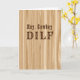 This humourous raunchy design greeting card says Hey, Cowboy DILF in large western looking letters on the front, with a faux wood grain background. Inside says Happy Father's Day and a suggestive adult humour line.