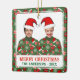 Custom and personalise this ugly Christmas sweater Christmas tree ornament featuring two people, both wearing the same Ugly Christmas sweater and Santas hat. Green sweater with very festive holiday pattern featuring red Christmas ornaments, santa claus hat, sugar plums, snowflakes, and Christmas stockings.