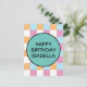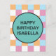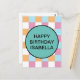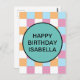 Cool, blue, orange white, and pink chequerboard pattern and a text template. To edit, click personalise and change the words.
