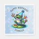 Personalised birthday paper plates. Cartoon frog dancing on a lily pad. Cartoon toad dancing with a birthday hat on.