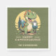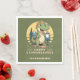 Create funny unique personalised paper napkins for a camping party. The design features a cute dinosaur drinking coffee outdoors (or other hot beverages such as tea, cocoa, etc.) The template makes it easy to type your family name or another text. This design is on the olive green background.