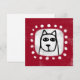 A cute drawn dog in black and white over a red textured background surrounded with white dots.