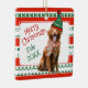 Funny dog with elf hat and scarf, on a very festive green and red holiday pattern as background. Customise Merry Christmas typography and personalise with dog’s name and year.