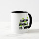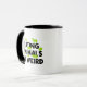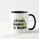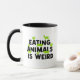 This "Eating Animals is Weird" mug features a quote with black lettering and farm animals.