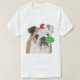This funny Christmas Tee Shirt, features a portrait of an English Bulldog, wearing a festive hat, and Christmas tree ornament earrings.