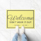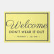 Give a warm yet funny welcome to your guests with this personalised welcome mat design. Design has a look of a simple welcome mat until closely read that it discourages guests from overstaying their visit. Words read "welcome don't wear it out" with family name and est. date below them. Design features dark grey calligraphic and modern lettering on a yellow background. A white border encases the letters on the mat. Design by © Ms_Jade. Shop other fun designs in my Zazzle store at www.zazzle.com/Ms_Jade*