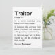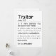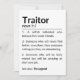 A humourous definition of "Traitor" is presented as a dictionary entry with a sarcastic tone, suggesting the term refers to a valued coworker who is leaving for a new job. It playfully labels the departing employee as a traitor for leaving friends behind but also acknowledges their potential for greatness in their next role.