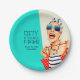 Host an outrageously funny and unique birthday party for a deserving woman celebrating her 50th Birthday with this retro glam 50th Birthday Party paper plate design. The design features a kitschy stylish woman in striped sunglasses and hair turban with a polka dot bag and striped towel, rocking her attitude. The humour is carried out in the bold text title "FIFTY IS THE NEW F-BOMB". Personalise the name with the fabulous Birthday Girl. The retro colour scheme of aqua, beige, navy and red adds to the fun of this design. These paper plates are available in 2 different sizes: 7" and 9" diameter. The smaller ones are great for serving cake or tiny bites and the larger ones work better for hors d'oeuvres and such.