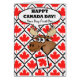 A funny moose breaks through a wall of maple leaf tiles on the cover of this Canada Day greeting card. Happy Canada Day! Your Very First One, text on the cover. Bold contemporary design in red, white, black, and browns. Art, image, and verse copyright © Shoaff Ballanger Studios.