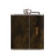 Fun fisherman's custom drinking flask done in an antique brown, with graphics of a green big mouth fish jumping to catch an orange bug. Orange text, on the front reads, Reeling in the big boys, one drink at a time. Personalise the orange text, on the back, for yourself or as a great gift idea to your favourite angler.