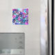 A funny little bird in the upper left corner and floral elements on a pink, purple and turquoise background.