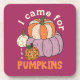 Funny four-pumpkins illustration. purple background and the saying: I came for the pumpkins. Perfect fall decoration for everyone, who loves cute pumpkins and funny sayings.