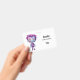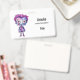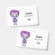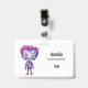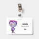 Name badge with a cute illustration. Frankenstein monster with pink and purple hair and a dapper coat and tie.