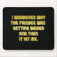 Bold yellow text on a black background presents a humourous pun about a frisbee getting bigger and then hitting someone. The simple design emphasises the joke's punchline effectively.