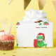 A funny cartoon frog who looks pretty grumpy. The green frog is standing up, as if human. The frog is wearing a red Santa Hat and is carrying a sack of presents. You can customise this with your own text and background colours.