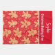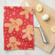 This is custom kitchen towel for Christmas baking crew featuring funny personalised Gingerbread man cookies pattern in different funny expressions with little snowflakes on bright red background .