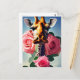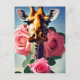 Adorable postcard features funny giraffe portrait with big pink roses.  Digital painting created with AI generating software.