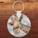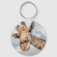 Button Keychaine with portrait image of a funny giraffe looking at the viewer up close as it stares in to the camera.