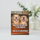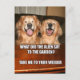 This funny meme postcard features a photograph of two golden retriever dogs who are laughing at a joke. The joke reads, "What did the alien say to the garden? Take me to your weeder." Text on back reads, "A joke to make you smile," but this can be changed or deleted.